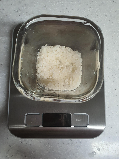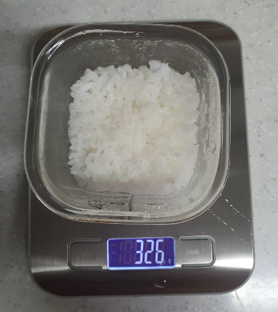 다된 밥 326g에서 그릇 무게 228g 빼서 밥 무게 98g