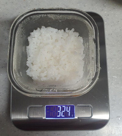 다된 밥 324g에서 그릇 무게 228g 빼서 밥 무게 96g