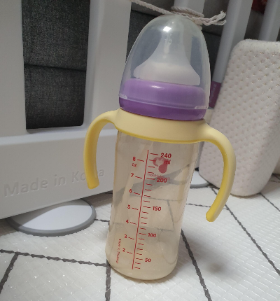 아직 똑바로 앉지 못하는 아이라 약간 비스듬하게 눕혔는데 양이 많을 때는 상관없지만 밑에 깔리는 분유 20ml 정도는 빨대가 저렇게 되어 먹을 수가 없다..