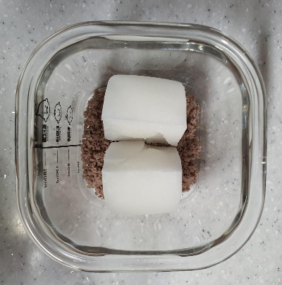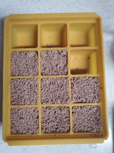 쌀미음 큐브 1개, 고구마 큐브 1개, 소고기 큐브 1개의 조합이다.
