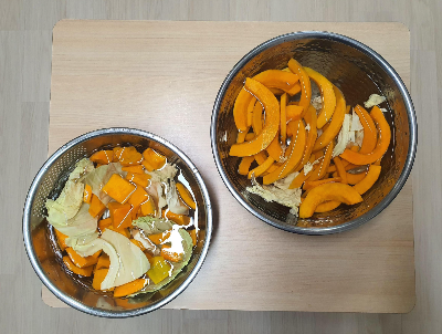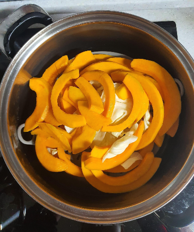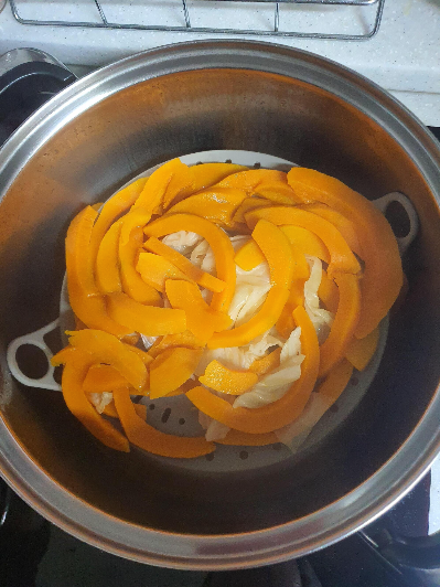 상대적으로 부드러운 양배추 속 부분과 구이용 단호박을 찐다.