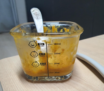 하도 안 먹겠다고 버텨서 이 정도 양에서 중단하고 이유식은 온기를 유지한 채로 보관해두었다.