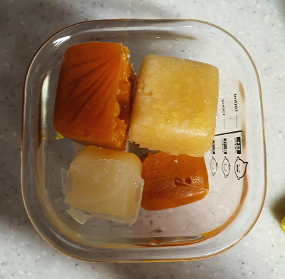 잘 얻어걸려서 밥을 다 먹는 날이 많아지면 똘망무시의 이유식 양도 늘지 않겠어?라는 마음으로 단호박 큐브를 한 개 더 추가함..