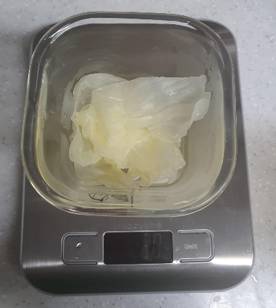 찐 양배추 중에서 매우 흐물흐물한걸 잘 골라서 이유식에 넣을 20g 선택