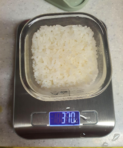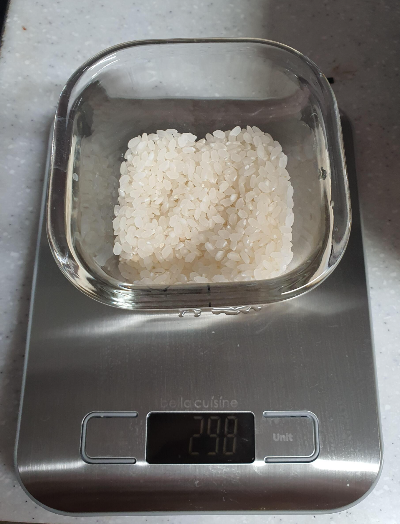 그릇째로 무게를 달아서 쌀 무게는 70g임