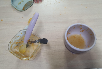 질감이 너무 질어서 먹는데 힘들어하는 것 같아 끓인 물도 조금 주었다.